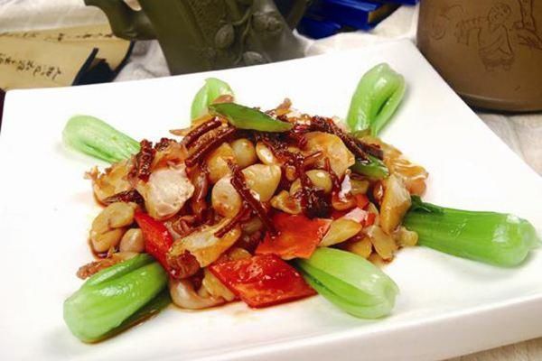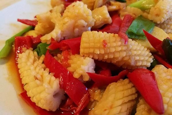 2.分别烫过水,使鱿鱼卷起卷,再和四季豆炒,勾薄芡。