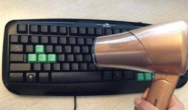 家里的电脑键盘最易积尘,但又不好清理。关掉电脑电源后,沿着键盘缝隙吹冷风,灰尘就都吹出来了。家里的小角落都能用这方法除尘。